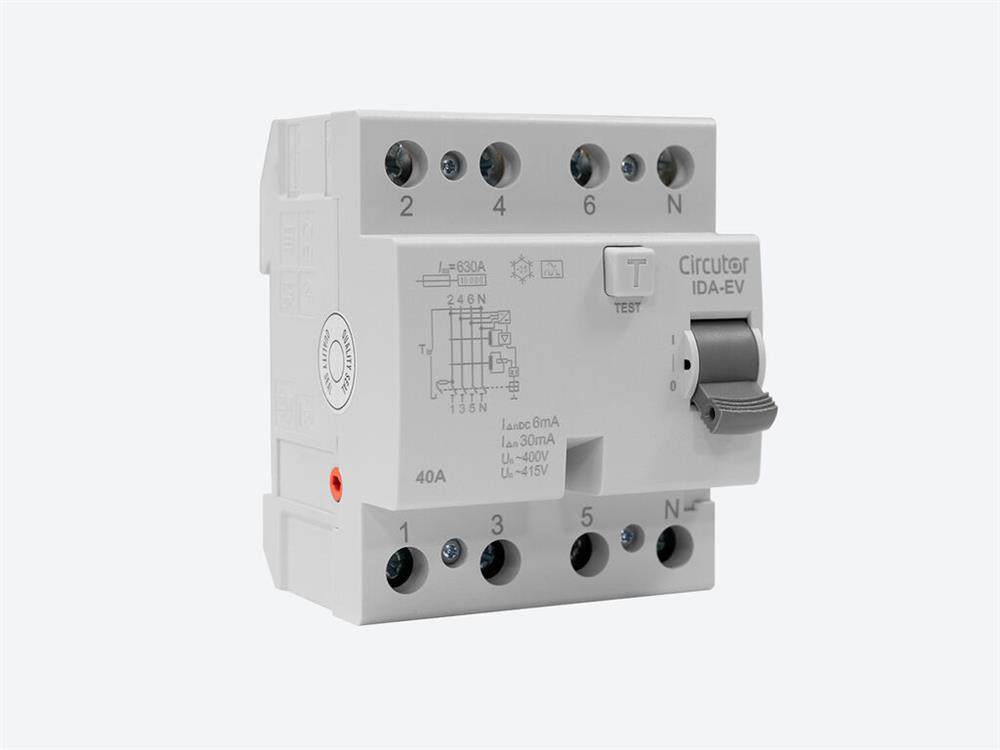IDA-EV is a 6mA DC type-A RCCB with monitoring for use in electric vehicle chargers. Compact RCCB that provides residual current protection, with a sensitivity of 30 mA and 6 mA DC monitoring for use in electric vehicle charging stations. Available in 40 and 63 A nominal current gauges, for three-phase and single-phase connections. It guarantees adequate protection at electric vehicle charging points, in accordance with the IEC 62955 standard.
